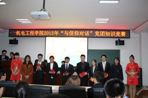 2015年4月11日晚7时,机电工程学院组织部在逸夫楼633报告厅拉开以“与信仰对话”为主题的党团知识竞赛团体总决赛的帷幕。机电工程学院团委书记、2012级辅导员陈星老师率机电工程学院第十届团委学生会主席团成员出席此次比赛并为大赛致词,预祝比赛圆满成功。