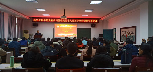 2020年11月26日下午,机电工程学院党委在逸夫楼633召开学习贯彻党的十九届五中全会精神专题党课。学院党委书记陈鹤梅主讲,学院领导班子成员、全体教工党员和学生党员代表80余人参加了此次学习。
