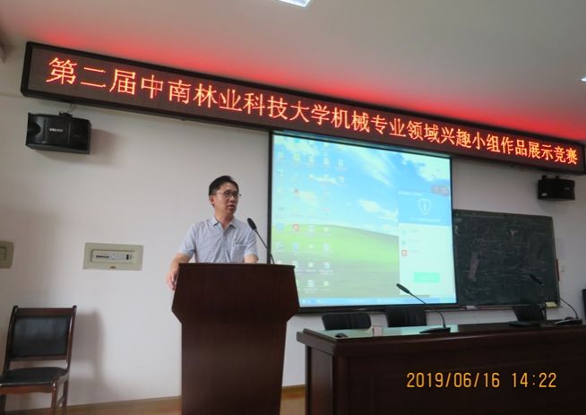 2019年6月16日下午,我院举行了第二届中南林业科技大学机械专业领域兴趣小组作品展示竞赛。竞赛开幕式由机械设计制造及其自动化专业负责人易春峰老师主持。闵淑辉副院长在开幕式上讲话,她勉励同学们努力学习专业知识,积极锻炼各种能力,培养责任感和使命感,希望同学们通过专业领域兴趣小组活动,建立对专业更深沉的热爱,通过不断深入的参与实际项目,养成自主学习习惯,形成创新思维,培养出解决复杂工程问题的能力,逐步建立工程自信。并预祝竞赛圆满成功;然后,易春峰老师宣布奖励方案和竞赛程序,下午2点10分,竞赛正式开始。