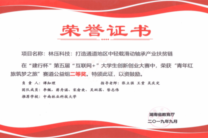 近日由机电工程学院张立强、吴庆定和国际学院王贲三位老师共同指导,由机电工程学院谭知理、李佩、昝志伟、龙治中、经济学院蒋舟谣、国际学院宋俞夌、吴砒茜、刘睿涵、黄咏琪、刘碧萝共10名同学组成的“林压科技”团队喜获“建行杯”第五届湖南省“互联网+”大学生创新创业大赛二等奖。