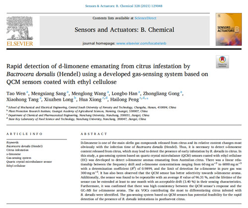 近日,国际Top期刊《Sensors and Actuators: B. Chemical》(中科院SCI一区,IF=7.1)在线发表了我校文韬教授课题组题为“Rapid detection of d-limonene emanating from citrus infestation by Bactrocera dorsalis (Hendel) using a developed gas-sensing system based on QCM sensors coated with ethyl cellulose”的研究论文。这是我校在农林产品品质检测领域的高水平研究论文,标志着我校机械工程学科在农林信息快速感知与智能化检测装备研究方向理论水平又迈上一个新的台阶。