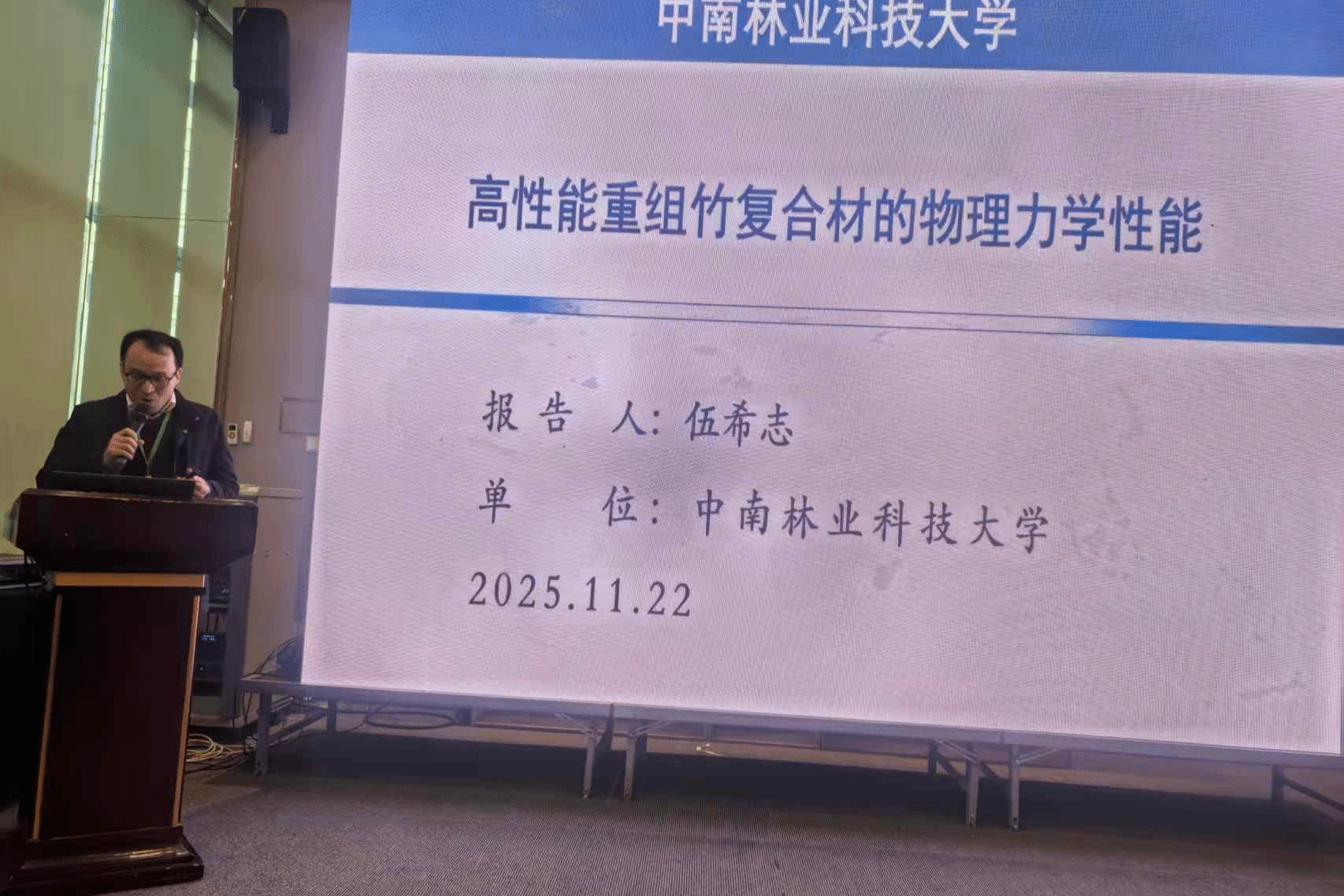 伍希志副教授做了“高性能重组竹复合材的物理力学性能”的学术报告,系统汇报了采用碱处理与湿热处理两种工艺制备高性能重组竹的研究,揭示了其增强物理力学性能的机理,为重组竹在绿色建筑等领域的产业化应用提供了关键技术支撑。