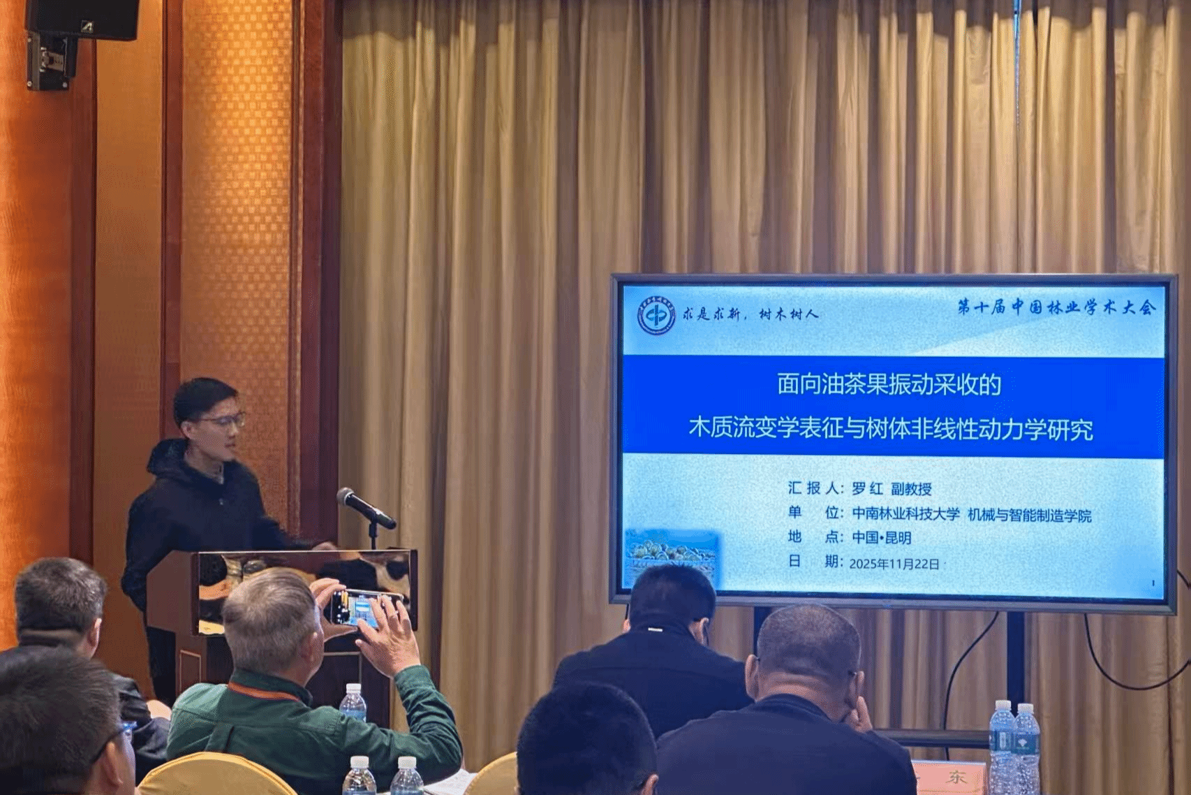 罗红副教授做了主题为“面向油茶果振动采收的木质流变学表征与树体非线性动力学研究”的报告,系统介绍了林业智能装备创新团队围绕自走式油茶果采收机的十余年研发历程与特色成效,重点汇报了团队在油茶木力学-动力学跨尺度建模方面的机理与方法突破,为油茶果等经济林果的高效低损精准采收提供了关键理论支撑。