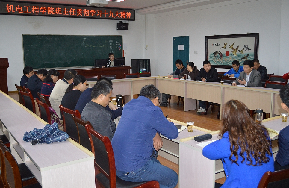 11月19日中午,机电工程学院班主任工作会议在逸夫楼633举行,学院党委副书记蒋炳春主持会议,全体班主任、学工办辅导员老师出席会议。会上蒋炳春组织班主任老师学习学习党的十九大精神,以积极的姿态迎接即将到来的本科审核评估。