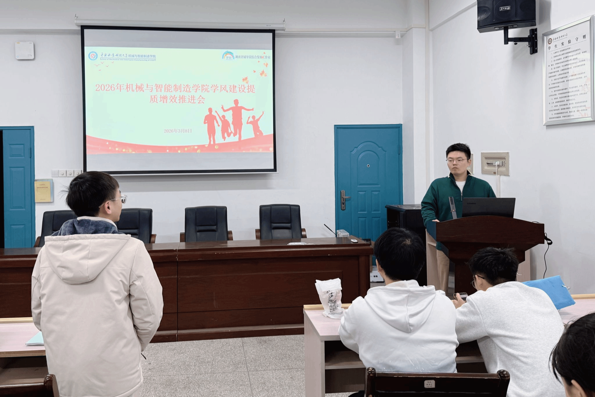 为深入贯彻落实立德树人根本任务,进一步推动学风建设走深走实,2026年3月8日,机械与智能制造学院在逸夫楼142会议室召开学风建设提质增效推进会。学院辅导员刘助旺老师主持会议,大一至大三年级全体学习委员参加会议。