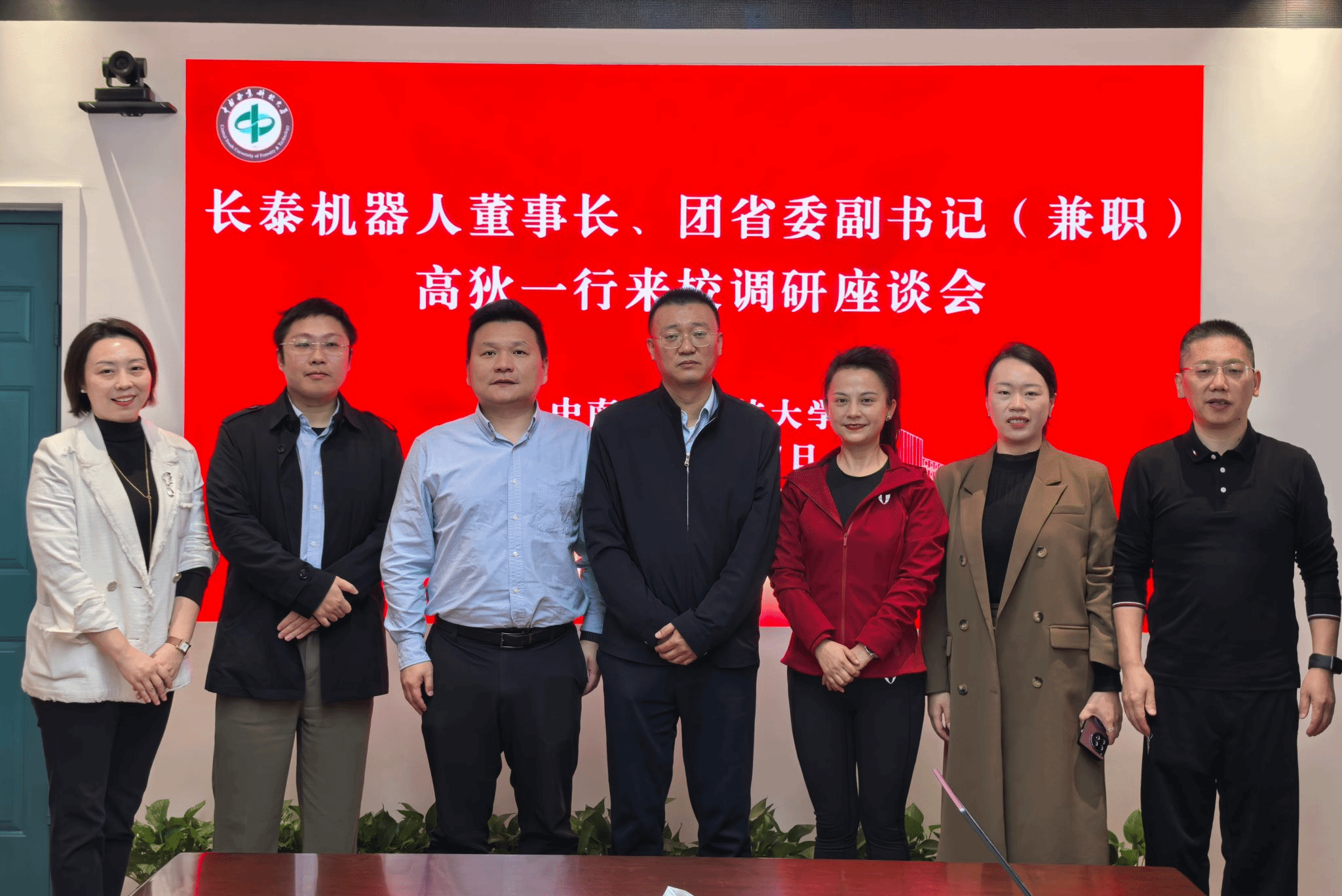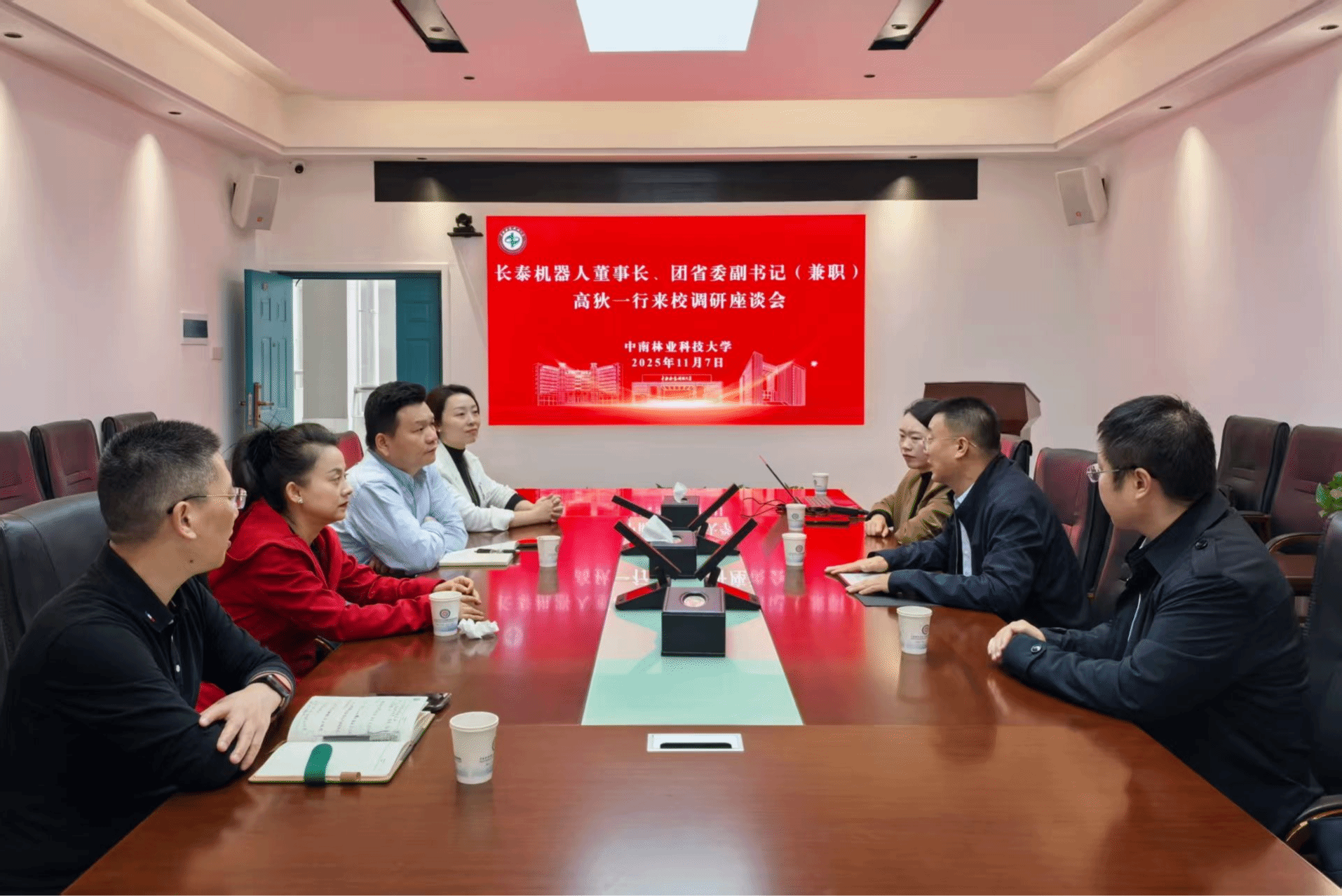 2025年11月7日上午,中南智能董事、长泰机器人董事长、共青团湖南省委副书记(兼)高狄一行莅临我院开展交流座谈并举行专场招聘会,学校团委书记殷丹、学院院长文韬、党委书记李红军、党委副书记徐钰婷出席座谈。