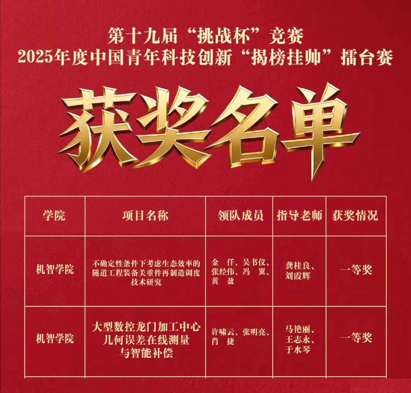 20251014日,由共青团中央等主办的挑战杯揭榜挂帅专项赛暨2025年度中国青年科技创新揭榜挂帅擂台赛高端装备制造领域主擂台赛在长沙成功举行。中南林业科技大学机械与智能制造学院参赛团队凭借扎实的科研素养与卓越的创新能力脱颖而出,一举斩获两项全国一等奖