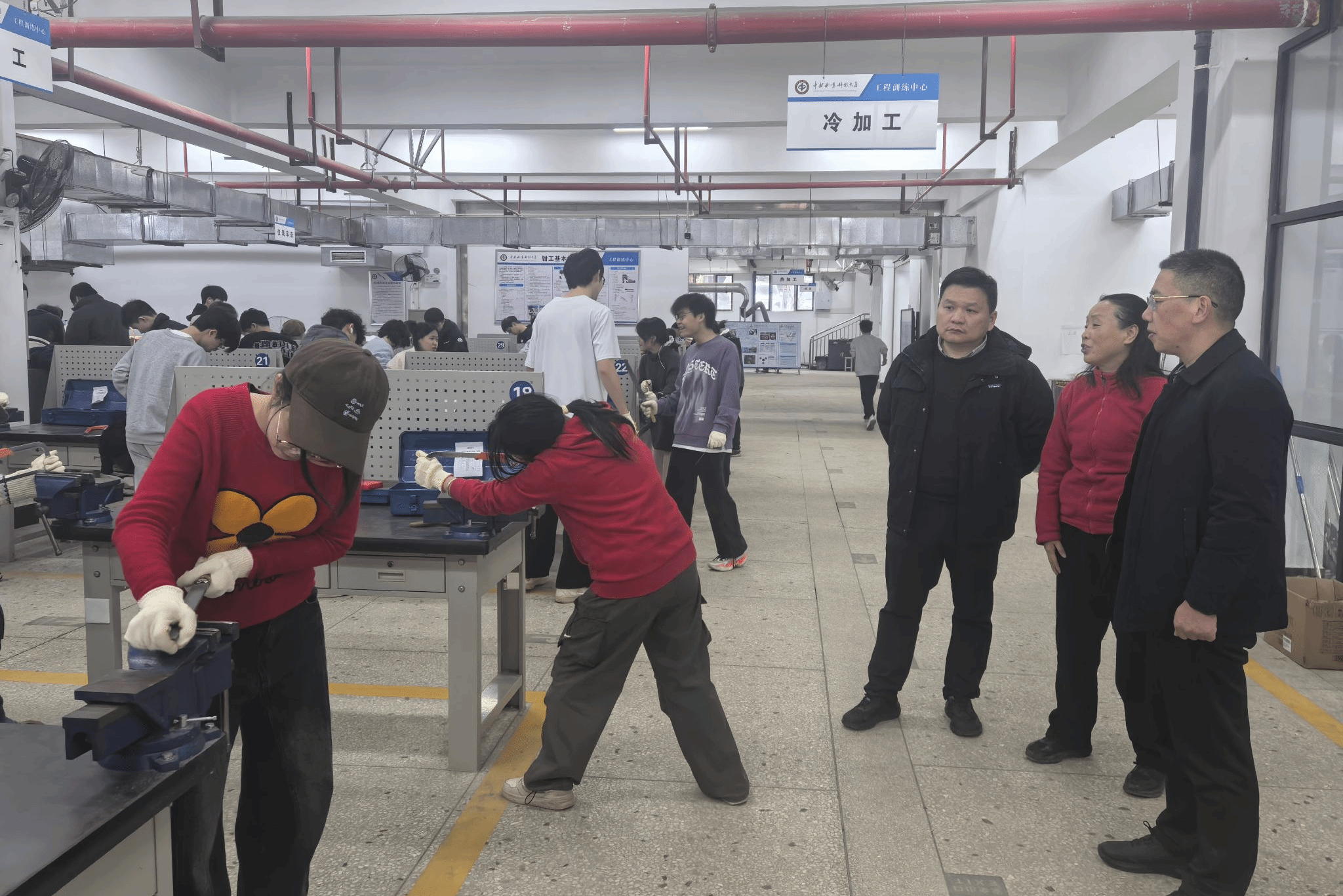 当日上午,学院院长文韬、党委书记李红军、副书记徐钰婷、副院长龚桂良一行来到工程训练中心,亲切看望慰问正在进行金工实习的师生,并重点开展实验安全检查与指导。