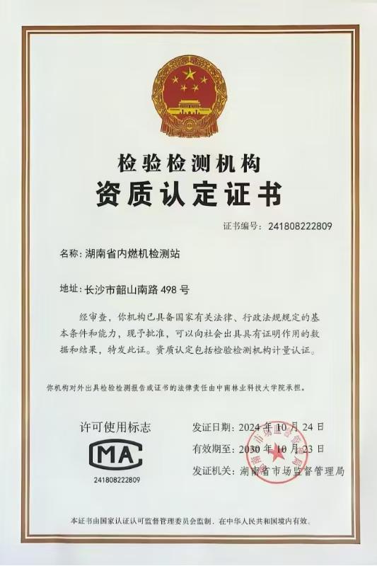 经过湖南省市场监督管理局认证认可处的复核,最终批准了湖南省内燃机检测站申请的共3类产品,76个参数的检测资质,于2024年10月24日向湖南省内燃机检测站颁发了检验检测机构资质认定证书。
