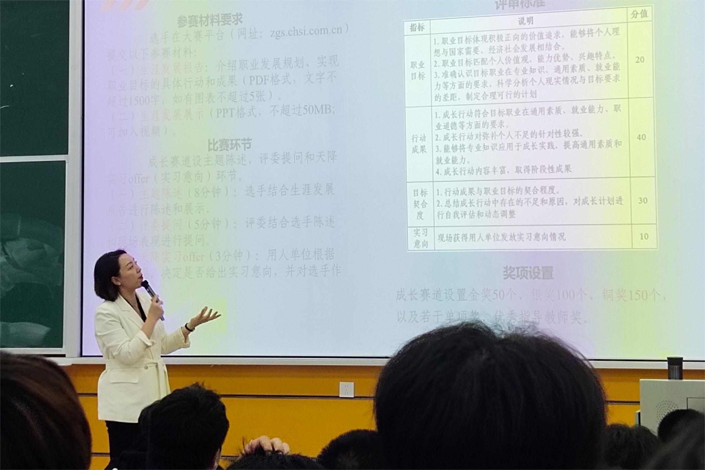 乐享生涯章节,徐钰婷引用生涯彩虹图,鼓励学生们在大学中积极开展生涯规划,珍惜大学时光,拓展综合能力,脚踏实地,奋斗拼搏,书写属于自己的生涯篇章。