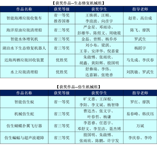 全国大学生机械创新设计大赛是教育部认定的重要的大学生学科竞赛之一,目前位列全国普通高校学科竞赛排行榜第八位。本届大赛以“自然•和谐”为主题,涵盖“仿生机械”和“生态修复机械”两大版块,湖南省赛区共吸引了来自国防科技大学、中南大学、湖南大学等35所高校的1500余名师生,参赛规模创历届新高。我校参赛作品能在全省众多作品中脱颖而出,充分展现了我校学子过硬的专业素质和敢于突破、勇于创新的精神风貌,彰显了在学校和学院党委领导下我院在“双一流”学科建设工作中取得的突出成效,此项成绩对于提高我校人才培养质量、提升专业建设水平具有重要意义。