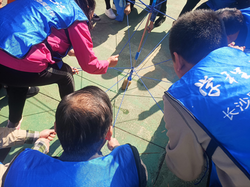 在短暂的“破冰团建”之后,参加活动的教职工被随机分为全部对、太阳队和热血队三支队伍,随后开展了“鼓舞飞扬”“神笔马良”两个团建项目。“鼓舞飞扬”是一个非常有趣配合性较强的项目,除了动手能力之外,还有协调和沟通能力,执行力必须保持一致。“神笔马良”由队员们分别掌控笔尾、笔杆和笔尖,还有两名队员负责纸张和墨水,所有队员巧妙地掌握不同的力道,在反复磨合后书写团队精神,让每个队伍发挥创意描绘出他们自己的“蓝图”,并予以解释。