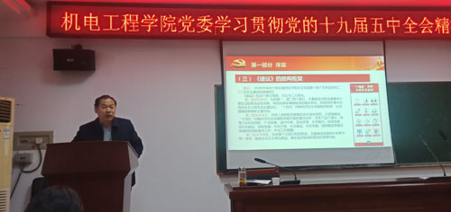 2020年11月26日下午,机电工程学院党委在逸夫楼633召开学习贯彻党的十九届五中全会精神专题党课。学院党委书记陈鹤梅主讲,学院领导班子成员、全体教工党员和学生党员代表80余人参加了此次学习。