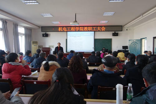 1月14日下午,我院在逸夫楼633报告厅召开2021年第一次全体教职工大会,审议和表决《机电工程学院2020年绩效工资分配方案(试行)》。全体教职工参加会议,会议由院党委书记陈鹤梅主持。