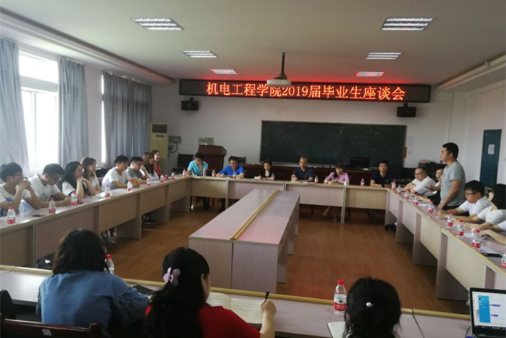 6月3日上午,机电工程学院在逸夫楼633报告厅室举行2019届毕业生座谈会。学院院长李立君、党委书记严爱军、党委副书记蒋炳春、副院长胡劲松、闵淑辉、张立强,行政办公室周鹰、肖诗慧,老师代表黄丹,毕业生辅导员陈星、汪柯岑以及2019届24名毕业生代表参加了座谈会。会议由严爱军主持。