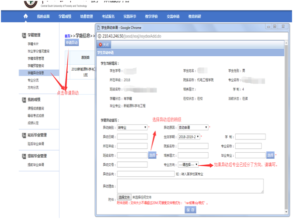 (2)2021年12月2日至12月6日,学生本人在教务系统学籍管理模块中提出异动申请,并提交《中南林业科技大学本科学生转专业申请表》(详见附件2)、申请书(手写)及必备证明材料,首先请班主任签字,再请专业负责人签字(均在申请书上签字),然后交至东园校区逸夫楼612吕老师(20级)和史老师(21级)处,申请截止时间:2021年12月6日11:00。注:若无必备证明材料或有作假行为均视为无效申请。
