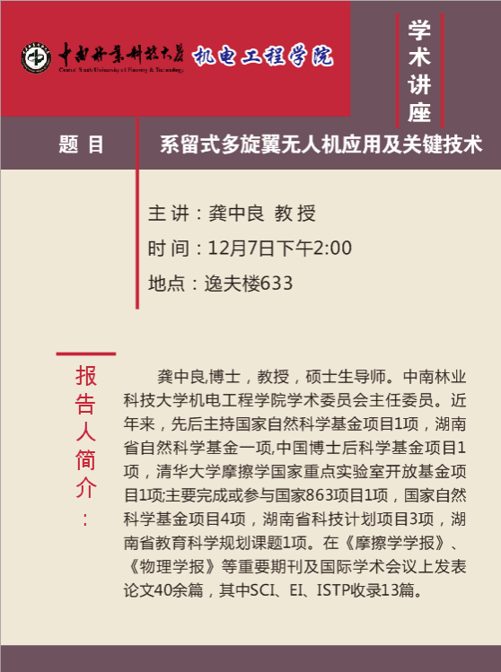 龚中良,博士,教授,硕士生导师。中南林业科技大学机电工程学院学术委员会主任委员。近年来,先后主持国家自然科学基金项目1项,湖南省自然科学基金一项, 中国博士后科学基金项目1项,清华大学摩擦学国家重点实验室开放基金项目1项;主要完成或参与国家863项目1项,国家自然科学基金项目4项,湖南省科技计划项目3项,湖南省教育科学规划课题1项。在《摩擦学学报》、《物理学报》等重要期刊及国际学术会议上发表论文40余篇,其中SCI、EI、ISTP收录13篇。